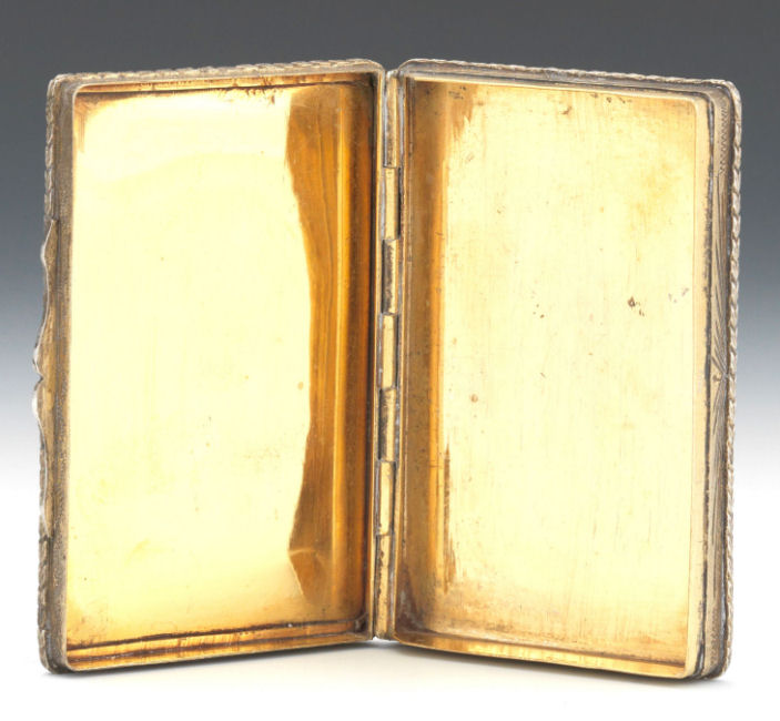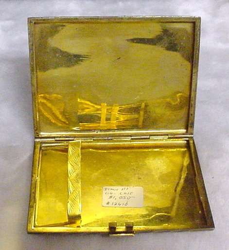 This stunning Italian sterling vermeil rare cigarette or calling card case features faux lapis trim, spring clip inside, and a rendition of the painting Guitarist and Four Figures Near a Statue by Jean-Antoine Watteau, circa 1705. Outside is sterling but inside has gold vermeil finish. It is a very pretty and rarely found piece. Very nice condition with only slight scuffs visible when held to light from normal wear. Measures 3-3/4" x 3" overall. Previously listed for $1,050. (Click on pic for more photos.) |