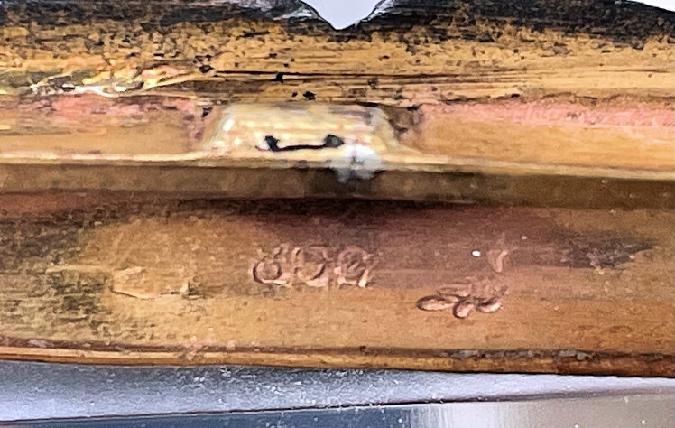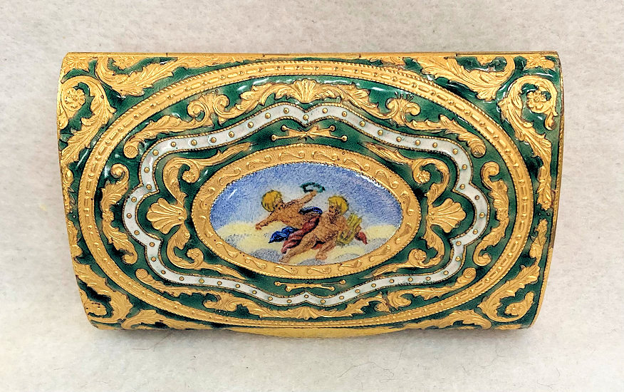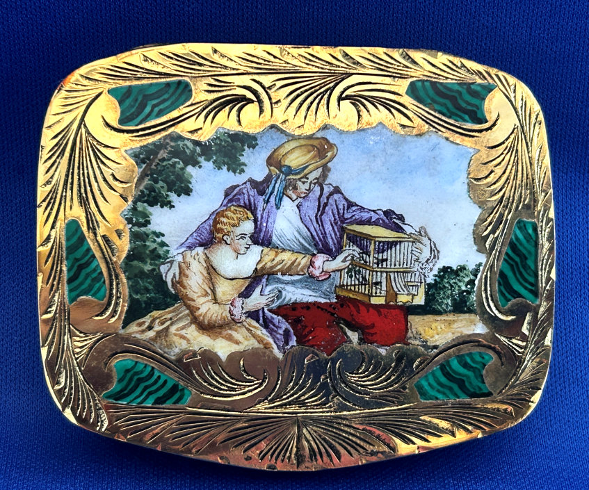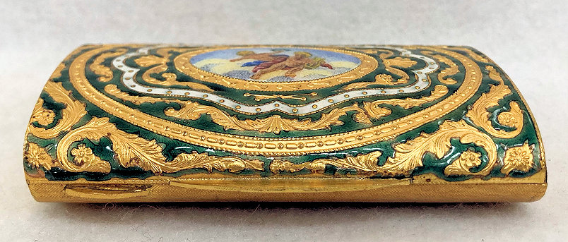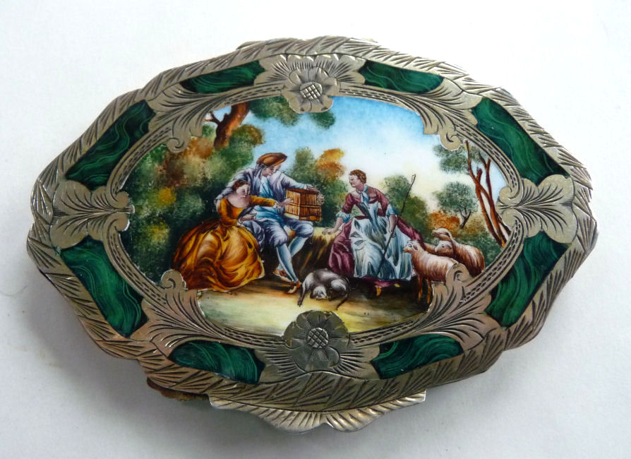 This lovely compact depicts a famous painting done by Nicolas Lancret circa 1735 entitled "The Birdcage" and features a romantic couple with a birdcage and a shepherdess with her flock and a dog reclining at their feet. The painting is quite detailed and has vibrant colors. The border is a rich emerald green faux malachite enamel. The case is ornately embossed on all sides. The interior is done in gold vermeil and there is a mirror in the lid. The mirror is not beveled so I suspect it is a replacement done by a previous owner as these are usually beveled. It is stamped 800 on the retainer on the mirror ... no other hallmarks are visible that I can find. The enameling is in excellent condition with only a few superficial scuffs visible only when held to light or with a loupe ...it is really superb. Measures 3-5/8" x 2-5/8". (Click on pic for more photos.) |
