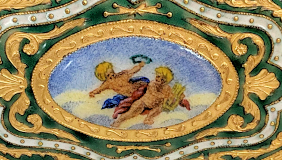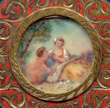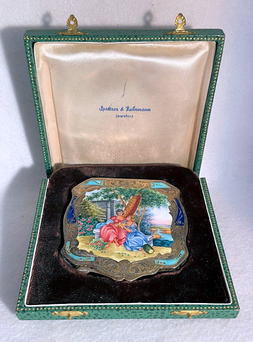 This is a rare scene that I have only run across one other time and it is offered here on this page much further down. The scene is an unusual one of two ladies holding a white dove. After extensive research, I have identified this as a rendition of François Boucher's "The Love Letter" painting done in 1750. This lovely example is in its original velvet-lined presentation box from Spritzer & Furhmann, the jeweler who sold it. The compact features a beveled mirror inside which is in excellent condition. The original powder screen is also still inside and in great shape. Enameling on compact is 99% perfect with only 2 miniscule dots that I had to search for with a loupe to find ... no scratches at all. Compact measures approx. 3" wide x 3-1/4" high. Presentation box measures 4-3/4" x 4-1/2" x 1". (Click on pic for more photos.) |