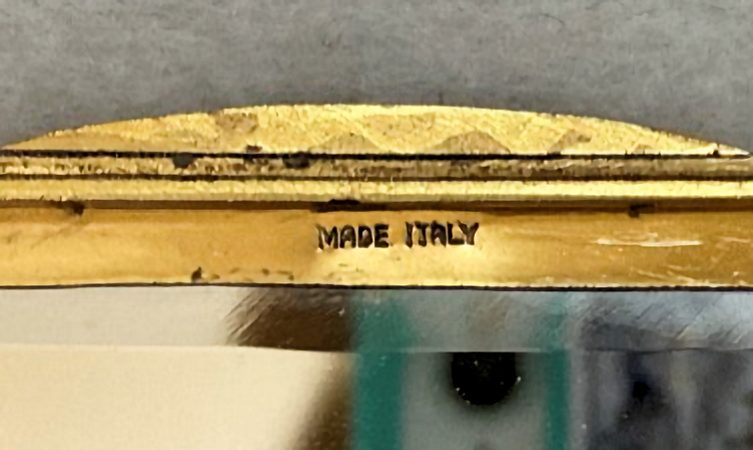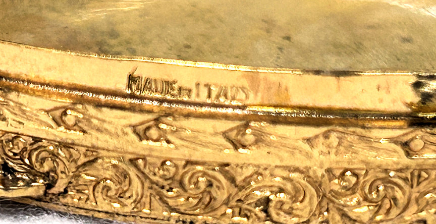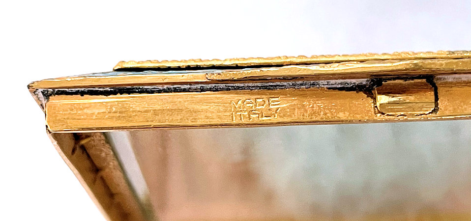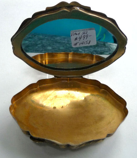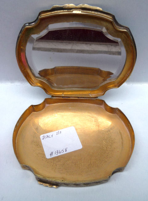Beautiful playful cherubs painted on an enamel sky with clouds set in a vignette surrounded in rich embossed gold and emerald green and white enamel. Although it is Made in Italy (as the stamp inside attests), it is not the typical sterling case. This one is a brushed brass on the sides and bottom and the top is very heavily embossed in very intricate and ornate designs. The shape of the compact is also very rare being oval when looking at it from the side. Very unique! When opened, there is a full size beveled mirror in the lid and a removable powder screen in the base. It is very clean and the compact snaps together tightly. Because it is not sterling, the price is about half of those. As mentioned it is marked "Made in Italy" above the mirror on the inside. It is in excellent condition with no damage whatsoever. Measures 3-1/8" x 2" x 3/4" deep. (Click on pic for more photos.) |