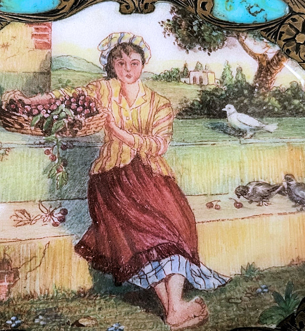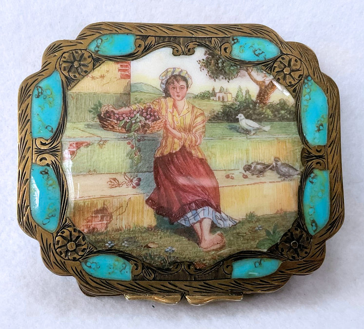 This beautiful compact depicts a young girl resting on a wall with a basket of cherries. Beside her are 3 birds -- two pigeons and a dove -- that she has fed some of the cherries. The painting is very detailed and quite lovely and one I have never had before so it is quite rare. The scene is surrounded by enameled segments to resemble turquoise inlays. Inside you will find a shaped beleved mirror in the lid and the original powder screen in the bottom. Also seen is a paper label "Made in Italy" still affixed to the bottom. Obviously this compact has never been used as there are no traces of powder inside. It is in extraordinarily perfect condition. I had to look for quite a while with a loupe to see even a teeny mark or two on the surface of the enamel but without really searching hard, it appears to be 100% pristine. Hallmarks on rim show swan, 800, and lozenge attributed to Ottavio Spinelli of Florence. Measures almost 3-1/2" x 3" overall.. (Click on pic for more photos.) |