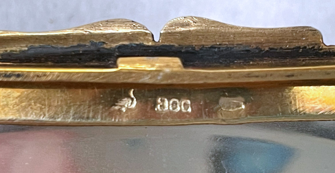 Here we have a wonderful romantic figural Italian sterling vermeil compact with a scene I have never run across before. This one features a young lad and lass sitting in an outdoor setting with a lake and mountains in the background. They appear to be in a discussion of some sort. There is a broken tree behind them with a fence beyond that. Cattails can be seen in the front right and rushes along the water to their left. It is just a beautiful scene surrounded by faux turquoise in an intricate border design. Interior has a large beveled mirror in the lid and open for powder in the bottom. Swansdown puff included. Stamped 800 in powder well. Enamel is in very good condition with only very minor superficial scuffs visible when held to light. Measures 3-1/2" x 3" overall. Previously listed for $1,250. (Click on pic for more photos.) |