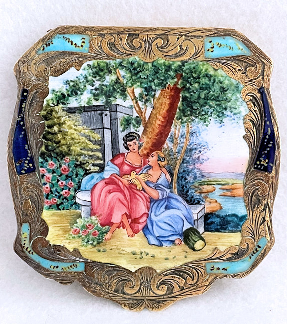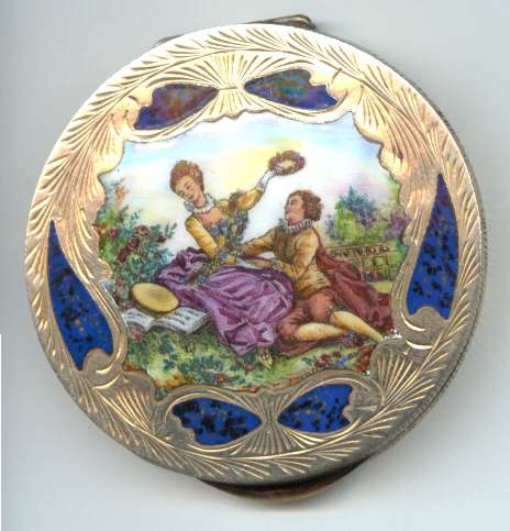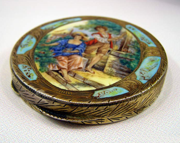 I like to refer to this one as my Romeo & Juliet compact as these two young lovers certainly remind me of that romantic couple. Beautiful vermeil case with faux turquoise enameling accented with tiny painted flowers ... back of case and sides are intricately embossed with scrollwork as is typical of these Italian compacts. Interior is fitted with a lovely shaped beveled mirror, and entire compact is in excellent condition. It is truly gorgeous! Previously listed for $825. (Click on pic for more photos.) |