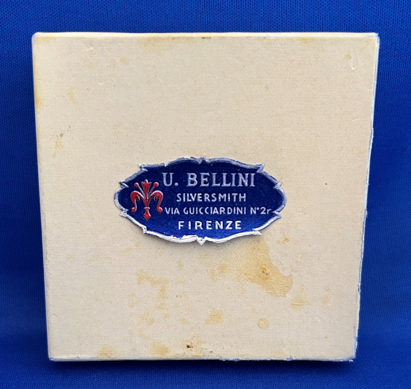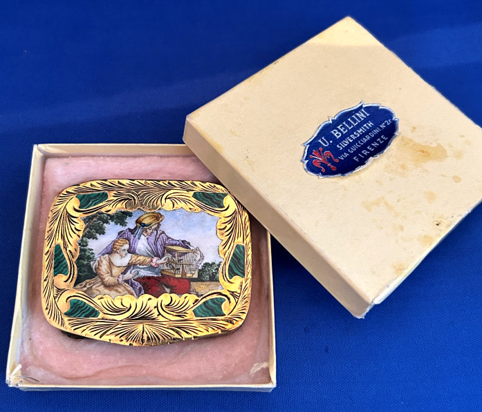 This beautiful compact features a hand-painted rendition of Nicholas Lancret's "Birdcage" painting originally done in 1740. The compact is still in the original jeweler's box fromU. Bellini silversmith in Firenze (Florence), Italy. The gold gilt on this compact is like the day it was made ... absolutely beautiful! In fact, the compact has never been used and still retains the original powder screen and a tiny pink feather puff in perfect condition. There is a lovely beveled mirror in the lid in excellent condition as well. The enameling is near mint with only a few very small scratches (not even sure how that happened since it has been inside this box) visible when held to the light. Measures approximately 2-3/4" x 2-1/4"; box is 3-1/4" square.. (Click on pic for more photos.) |