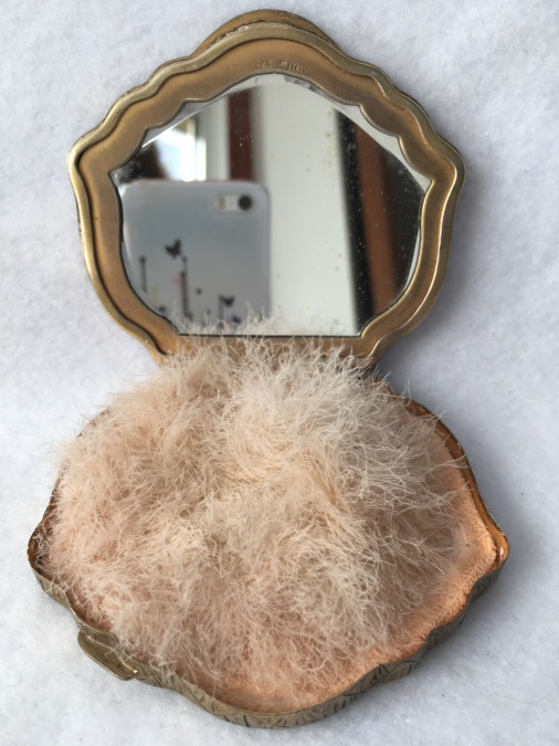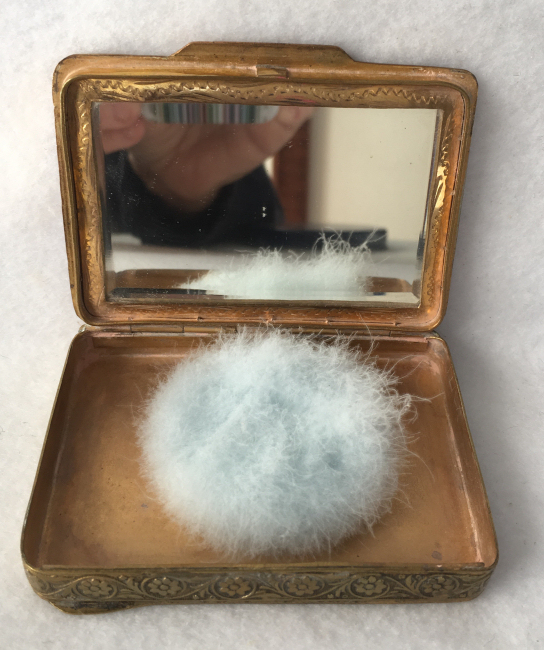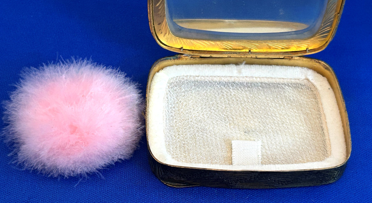 This is a truly intricate scene and one I have not had before nor could I find another anywhere on the internet like it. There is a woman on the left nursing a baby while a young man approaches with a lamb. There is a donkey with doves on his back, sheep on the ground, and two dogs. Just so much going on! The scene is hand-painted and is surrounded by faux turquoise enamel. Inside you will find a beveled mirror in the lid, powder screen in the base, and a lovely pink swansdown puff with the original label still attached. I can't make out the wording on the label but it appears to be French. The enameling is in mint condition with no scuffs, scratches, chips or damage of any kind. The mirror is clear and also perfect. This is about the best condition you will find in these compacts with no apologies whatsoever. It measures 3-1/4" x 2-5/8" overall. (Click on pic for more photos.) |