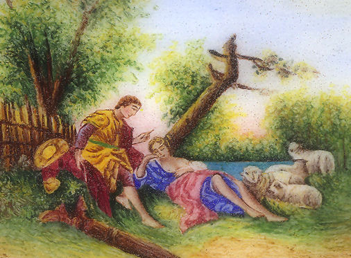 This lovely Italian sterling vermeil compact features a romantic couple with the woman partially nude in a state of deshabille'. A flock of sheep rests alongside them. Interior features a beveled mirror in the lid which is cracked but otherwise usable ... another rendition of a painting entitled "The Sleeping Shepherdess" by Francois Boucher. Enameling is in mint condition with no scuffs or scratches visible to my eye. Compact measures 2-3/8" x 2" overall. Previously listed for $499. (Click on pic for more photos.) |