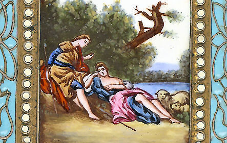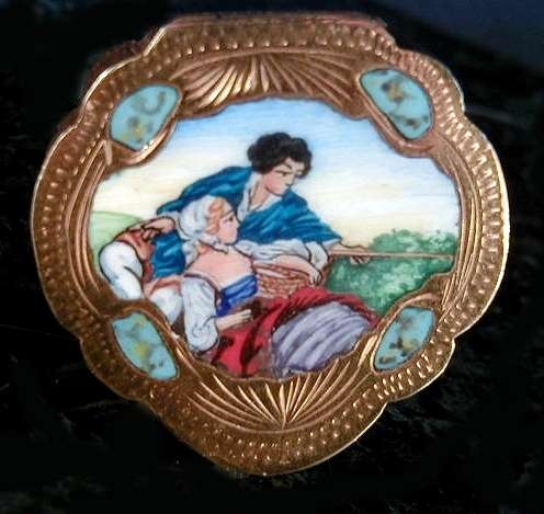 This is a rather unusual and unique Italian sterling vermeil compact with a romantic couple in the center of a wide faux turquoise enameled border. The scene is charming with a sheep lying beside a young woman who appears to be re-tying her love's neckerchief. Interior features a round beveled mirror in excellent condition and original powder screen and puff inside. Enameling is in very good conditoin with only a few very minor scuffs from use visible with a glass or when held to light ... no significant damage anywhere. Hallmarked "Italy" and "800" inside. Measures almost 3" diameter. Previously listed for $475. (Click on pic for more photos.) |