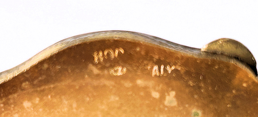 Here we have a very sweet figural sterling vermeil compact with a scene featuring a lovely gowned lady with several courtiers surrounding her. Rich faux turquoise enameling around the edges matches the color of her gown ... it is more turquoise and deeper than the picture shows. Interior features a round beveled mirror in the lid and open powder well in base with some wear. It is signed Coppini Co. and marked "800" and number "278". Enameling is all excellent with minor superficial scuffs visible only when held to light. There are a few tiny dents in the bottom but they are only visible from the inside. Measures 2-5/8" diameter. (Click on pic for more photos.) |