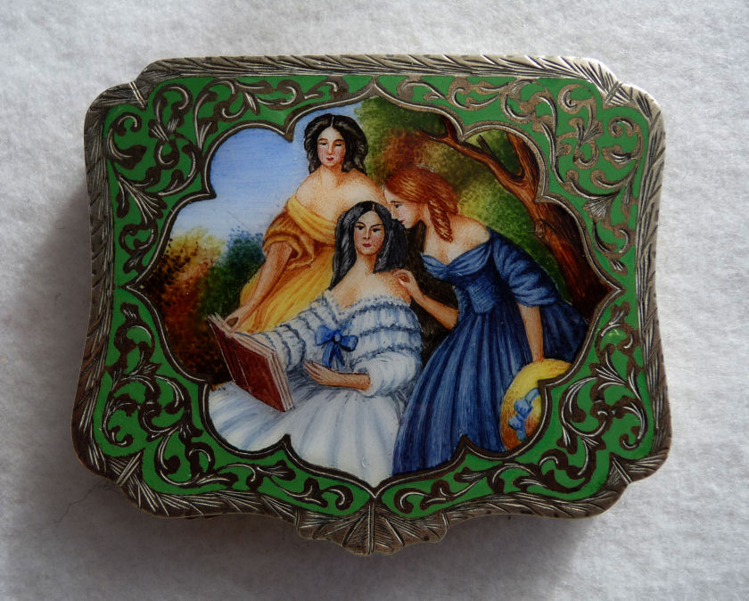 This lovely Italian sterling vermeil compact depicts three women in a garden setting with a book and reminds me of Louisa May Alcott's "Little Women". In fact, there are several paintings with very similar scenes done of Little Women with a book in a garden so this could very well be taken from one of those. The colors are very vibrant and the border is done in champlevé green enamel. Inside there is a full mirror in the lid and a powder screen in the base. It is marked with a lozenge and 800 stamp on the bottom of the inside. Condition overall is very good with some surface scratches visible only when held to light at an angle. Since the colors are so deep, they are truly very hard to discern unless you are looking for them. Measures 3-1/4" wide x 2-3/4" high. (Click on pic for more photos.) |