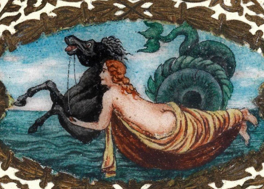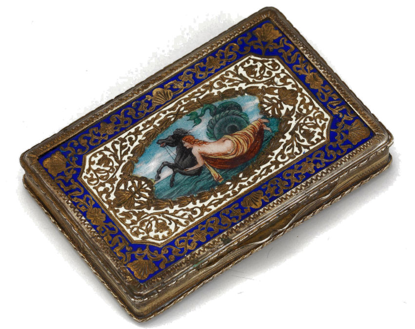 This stunning Italian sterling vermeil compact features a rare painting of a partially nude Greek Nereid (sea nymph) with flowing red locks riding on a hippocamp. The scene is replicated from a mosaic tile floor found in the ancient Terrace House #2 in Ephesus, Turkey, which dates from the late 1st or 2nd century AD. What a wonderful find! The scene is set in champlevé enamel in white and surrounded by a border in deep cobalt blue. This really sets off the center painting. The sides of the compact are incised with designs all the way around and this is duplicated around the bottom edges as well. The interior is done in bright gold vermeil on top and bottom. There is no mirror nor is there any indication of one ever being inside. A new swansdown puff is included. The enameling is in great condition with no losses or chips. There are a handful of tiny scratches in the clearcoat only on the painting portion but nothing through the color but can be felt with your fingernail. They do not show up to the naked eye, though, unless turned to light. It is stamped 800 for sterling on the front rim. The compact measures approximately 3" x 2". To read more about the Terrace Houses and view photos, click here. (Click on pic for more photos.) |