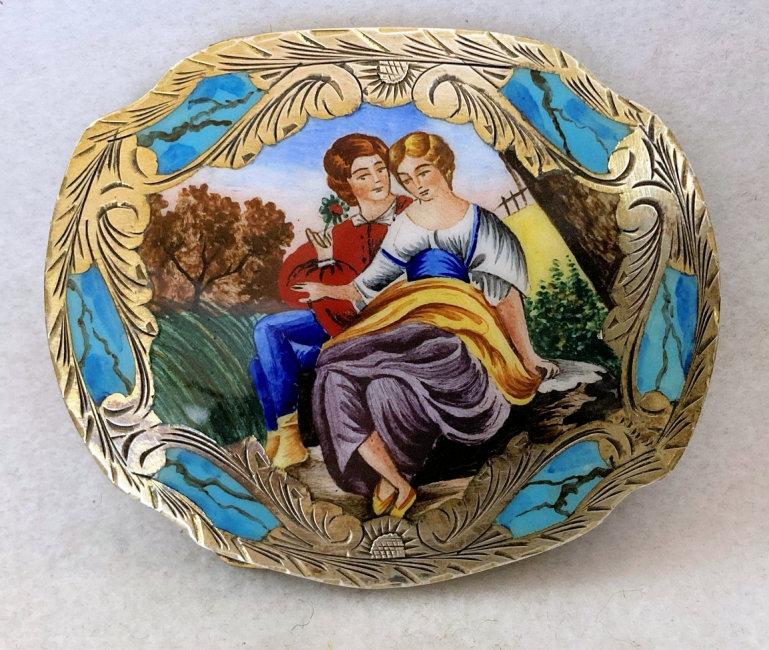 I've seen lots and lots of romantic couple scenes on these Italian sterling vermeil compacts, but I've never run across this exact one. It depicts a young couple out on a stroll ... the gent has his walking stick and the lady is holding a basket full of something green that they must have been picking (I hope it's flowers! LOL). The scene is surrounded by faux turquoise insets and richly scrolled silver. Normal surface scuffs visible when held to light and what appears to be a small factory flaw in the lower left side of the scene (doesn't detract at all from scene). Interior features a round beveled mirror in lid and removable powder tray in base. Measures 2-7/8" diameter. Previously listed for $675. (Click on pic for more photos.) |