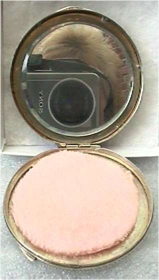 This is an extremely rare compact and one of the only ones ever found done by a Spanish painter. The original painting for this compact was done in 1786 by Spanish painter Francisco Goya and is one I have never had before and only seen one picture of in all my years of collecting. The compact is in mint condition on the outside ... there is not a single scuff, scratch, nick or anything on the shiny enamel finish. Just gorgeous! This compact features faux turquoise and lapis enameled insets around the perimeter and is all done in sterling vermeil. The inside has a shaped wide beveled mirror in the lid and the original powder screen and swansdown puff in the base. In the powder well is the marking for 800 (sterling), a lozenge hallmark, and FALLACI FIRENZE for the company that made it in Florence, Italy. It measures 3-1/4" across x almost 3-1/8" high. (Click on pic for more photos.) |