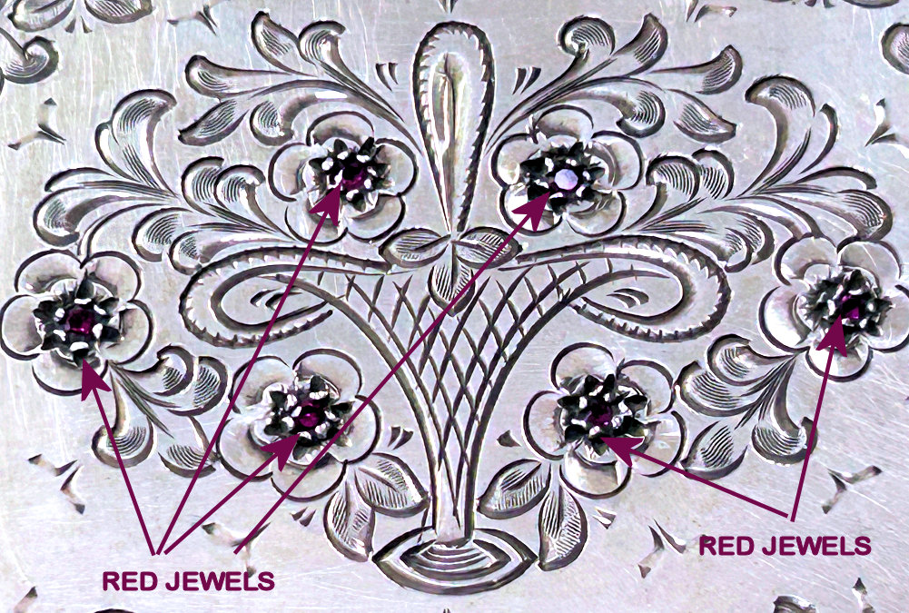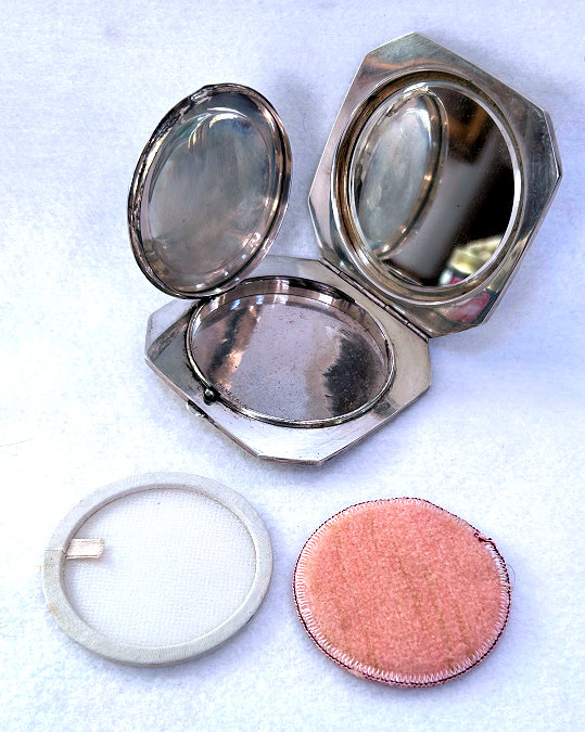 This is a very high-end sterling silver compact made in Italy with 6 "ruby" jewels prong-set in the center of the flowers in the engraved flower basket on the top. The compact has a spring-release lipstick which is also the secret way to open the compact. When you push in on the lipstick, the lid pops open. Inside is a full-size beveled mirror in the lid and an open powder well in the bottom. There is a new swansdown puff inside as well. There are traces of lipstick in the lipstick holder on the sides only and there is no trace of any powder inside. It is a truly beautiful compact and totally usable today. This beauty measures 2-7/8" x 2-1/4" x 7/8" high. (Click on pic for more photos.) |