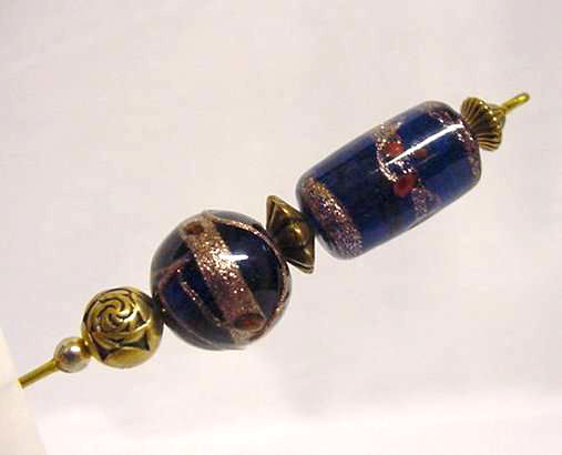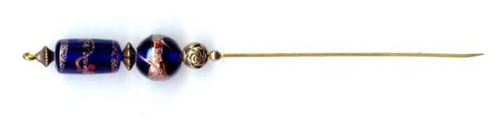Fabulous Venetian cobalt glass hatpin with jeweled round ball in center. Gold Murano flecks throughout! Measures 6" overall. (Click on pic for more photos.) |