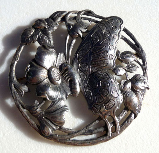 Beautiful sterling silver brooch signed by Guglielmo Cini featuring a butterfly and flower. Measures 2-3/4" diameter. (Click on pic for more photos.) |