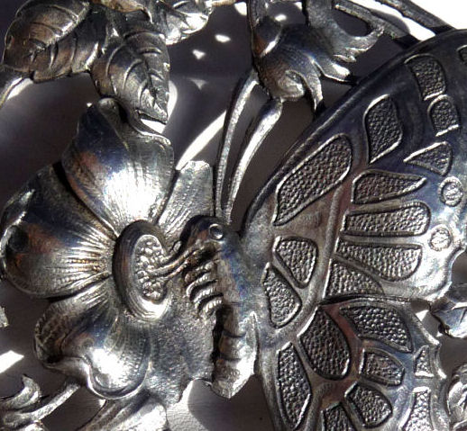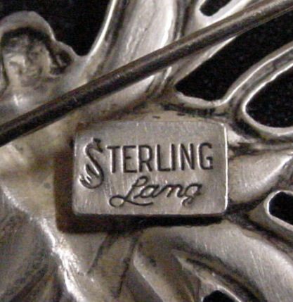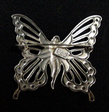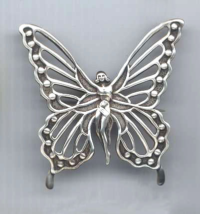 Lovely little art nouveau nymph butterfly in sterling silver designed and signed by Lang. Circa 1940. Measures approximately 2-1/4" x 2-1/4" overall. (Click on pic for more photos.) |