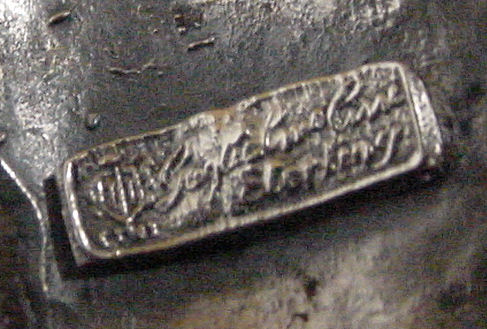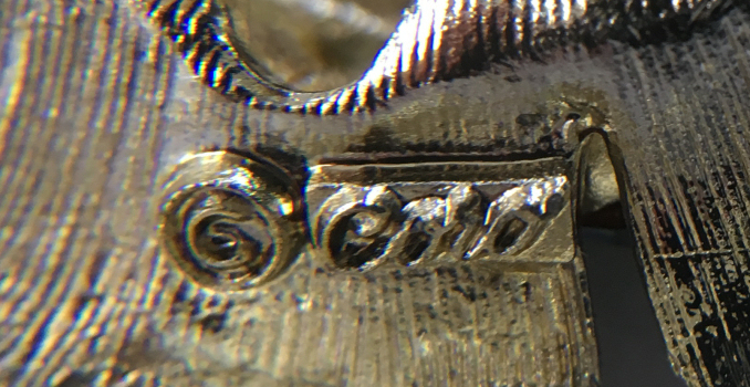 What a gorgeous piece of jewelry this is! A blue enamel guilloche sterling silver pin with pink hand-painted roses on either side. It looks to be a bow but also resembles a butterfly to me ... and the body portion is actually an open-ended clip to hang a watch or a monocle. It is in mint condition with no enamel loss whatsoever and is hallmarked "Argent Dore, 925" on the back. Measures 1-3/8" across. (I was told that Argent Dore stands for Sterling in French.) (Click on pic for more photos.) |
