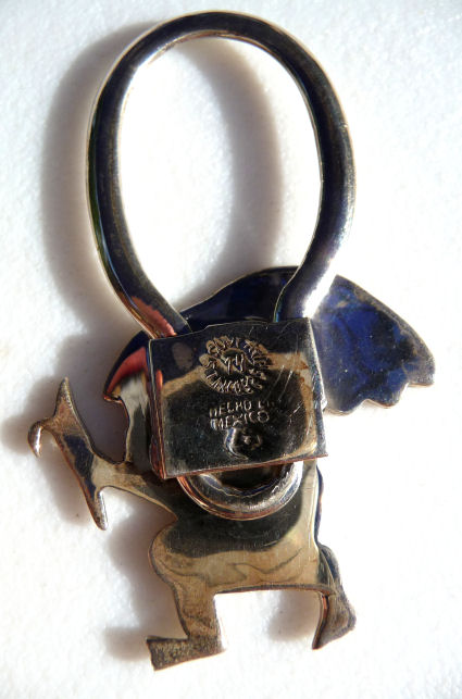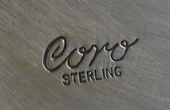 This is a classic design by Coro of an eagle in flight ... it is solid sterling silver and nicely detailed. Pin-back design, signed Coro Sterling on the back. It measures 4-1/2" from left wing tip to bottom of tail and almost 3" across from wing tip to wing tip. It measures 3-1/4" from left wing tip to bottom of talons. (Click on pic for more photos.) |
