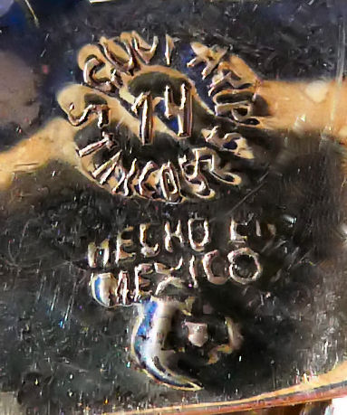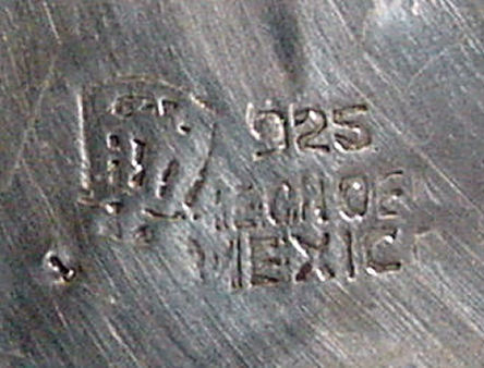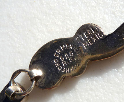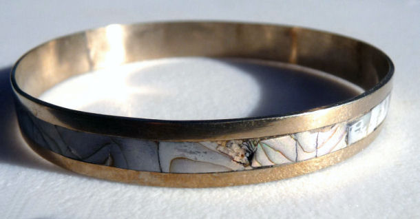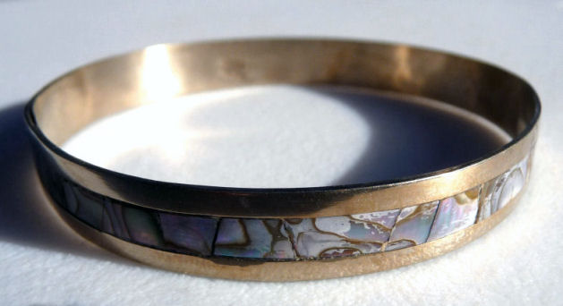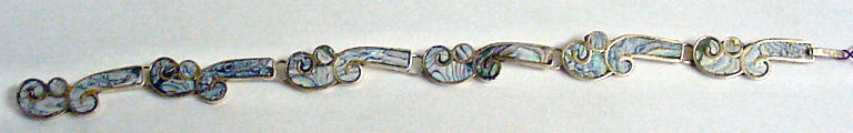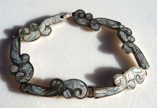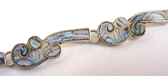 Sterling silver and inlaid abalone pearl bracelet, made in Mexico. Measures 8-1/4" end to end. (Click on pic for more photos.) |