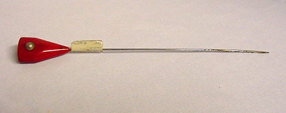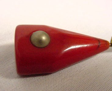 Bright red catalin with bead in center, both sides the same. Measures 8-1/4" overall, bakelite tip is 1-5/8" x 7/8" x 1/2". (Click on pic for more photos.) |