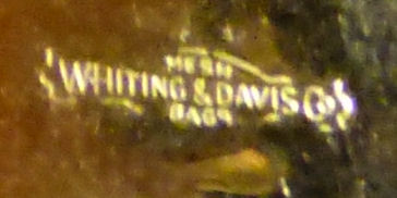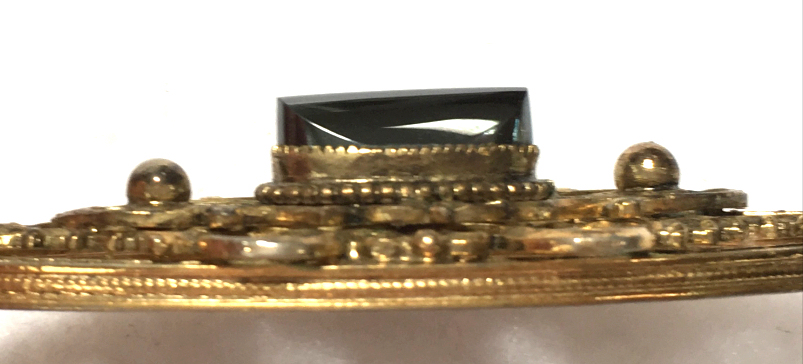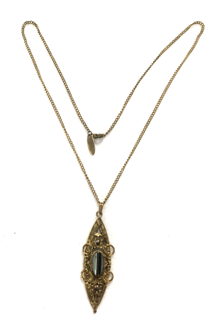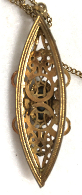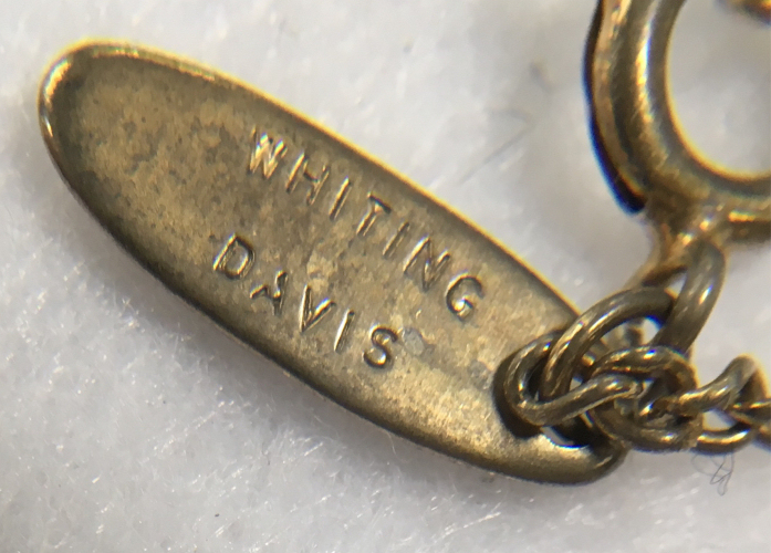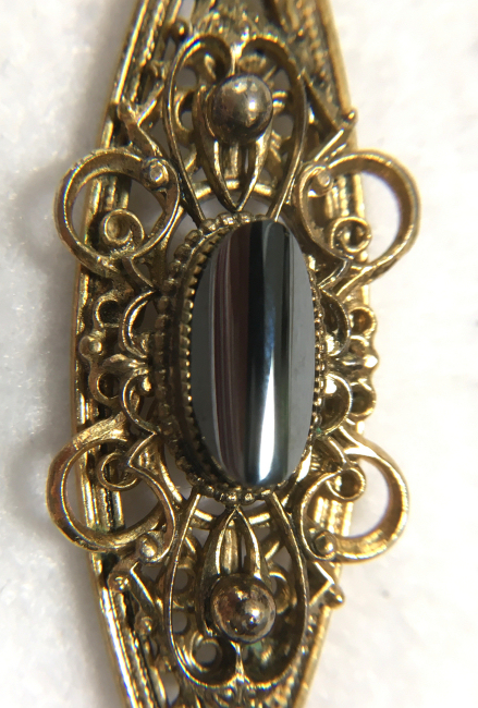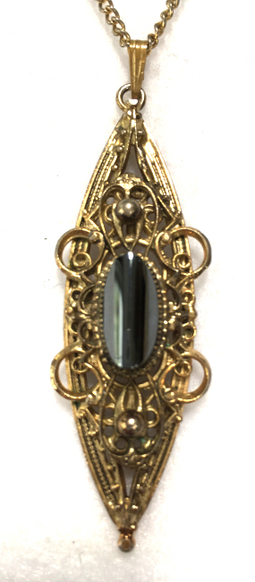 Beautiful vintage Whiting Davis filigreed necklace with hematite stone. Pendant is quite large measuring 2-3/8" long x 7/8" across. The hematite stone has a really pretty shape to it and is highly polished. The chain has a tag which reads "WHITING DAVIS" and measures approximately 22" long with a small bail at the bottom. It is in excellent condition. (Click on pic for more photos.) |