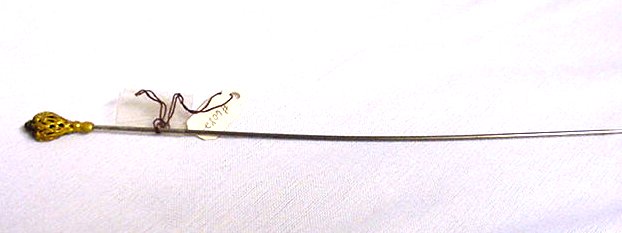Beautiful filigreed hatpin with sapphire jeweled tip. Measures 6-1/2" long overall. (Click on pic for more photos.) |