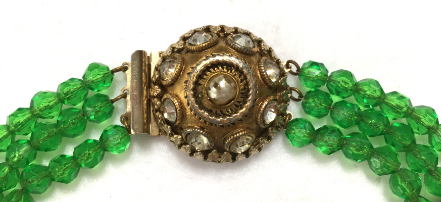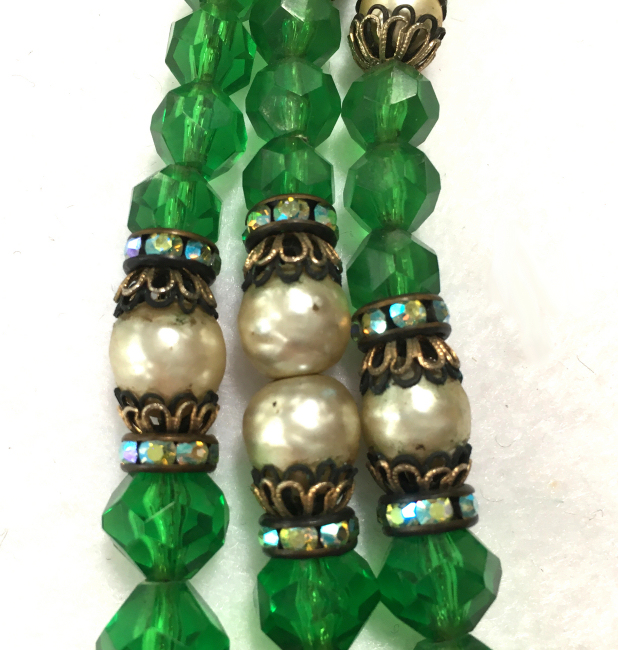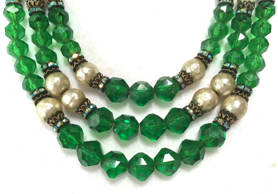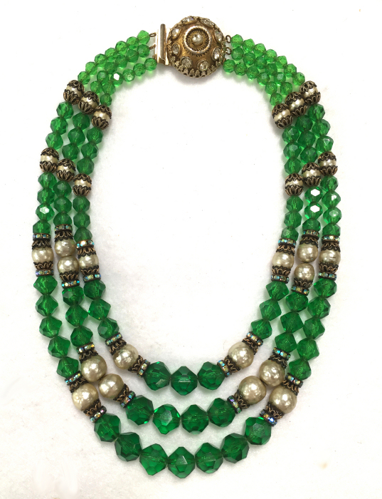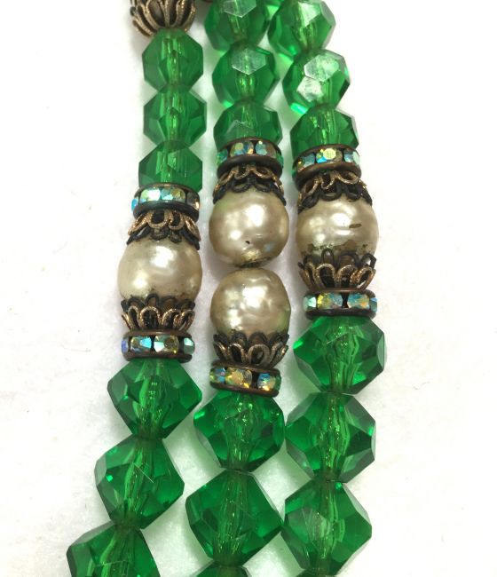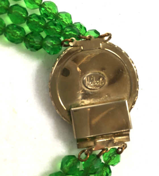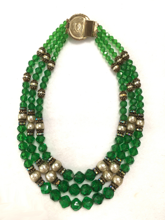 This beautiful emerald green necklace was made by Hobé probably in the 1940's or before. It has facet cut green beads and pearlized beads with iridescent crystal roundels between. The clasp is also extremely ornate with jewels set all the way around. It has three strands in gradiating lengths to rest perfectly around your neck. It is signed on the back of the clasp. All stones are intact and in excellent condition for its age. The only wear is on the center pearl on the clasp, all else is beautiful. No missing stones! It measures 10" long (drop from clasp to bottom of longest strand) and 17" long when opened (shortest length strand). (Click on pic for more photos.) |