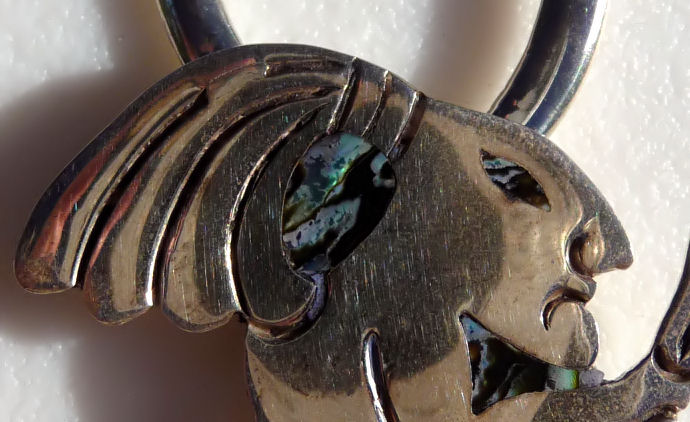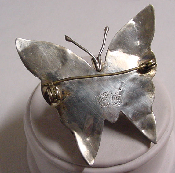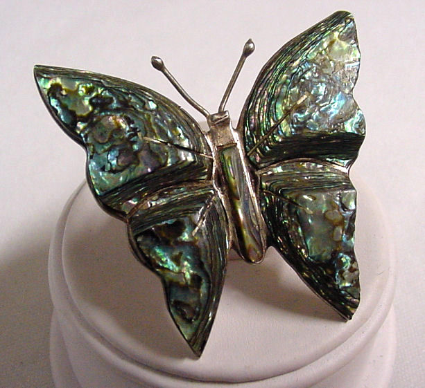 Here is a lovely vintage butterfly pin in shimmering rich colors of abalone mounted on sterling silver. Hallmarked Hecho en Mexico and 925 plus the manufacturer's seal on the back, it is a beautiful piece in excellent condition. The luminosity of the abalone shell actually resembles a real butterfly! Measures almost 2" across at wing tops and 1-3/4" high. (Click on pic for more photos.) |