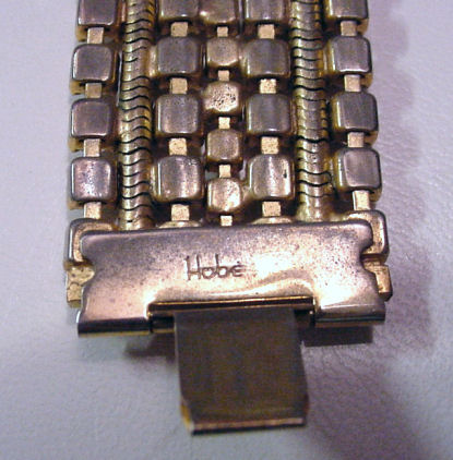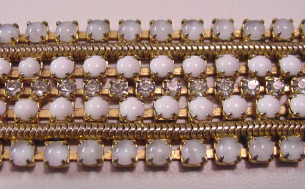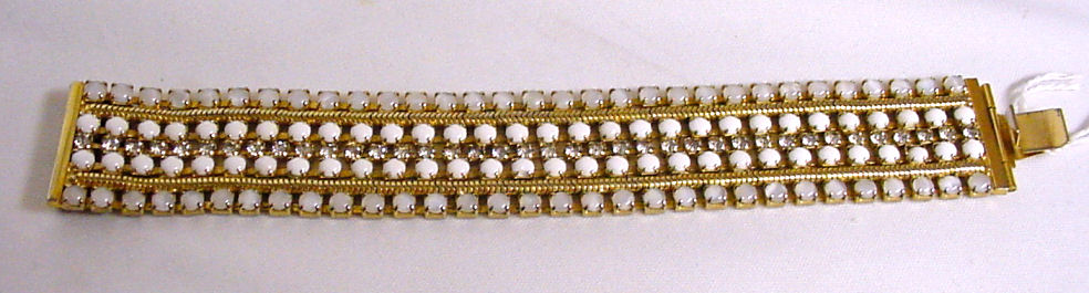 Wonderful solid beaded bracelet in synthetic opals and white stones on gold tone base. Signed Hobe' and measures 7" long x 1" wide. In excellent condition with all stones! (Click on pic for more photos.) |
