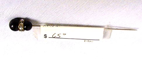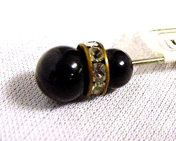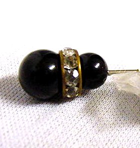 Two jet colored beads separated by a band of faux diamonds. Matches pearl "diamond" hatpin shown below. Measures 3-1/8" overall. (Click on pic for more photos.) |