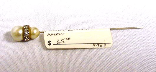 Two pearl beads separated by a band of faux diamonds. Matches black "diamond" hatpin shown above. Measures 3-1/8" overall. (Click on pic for more photos.) |