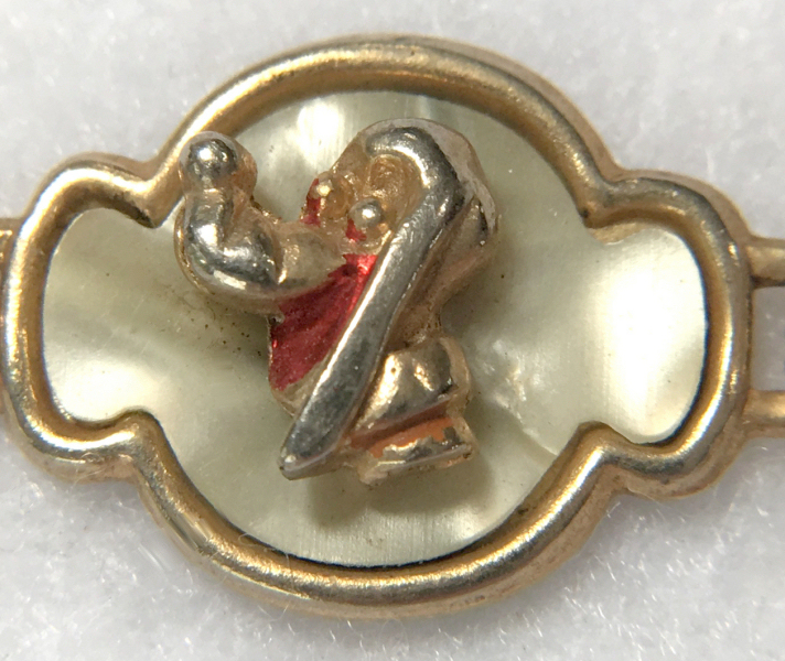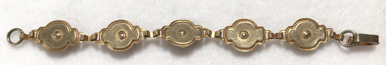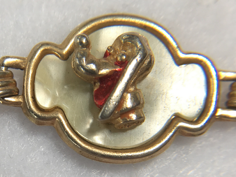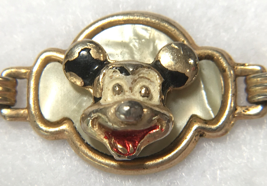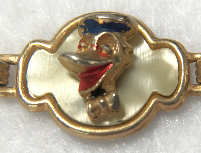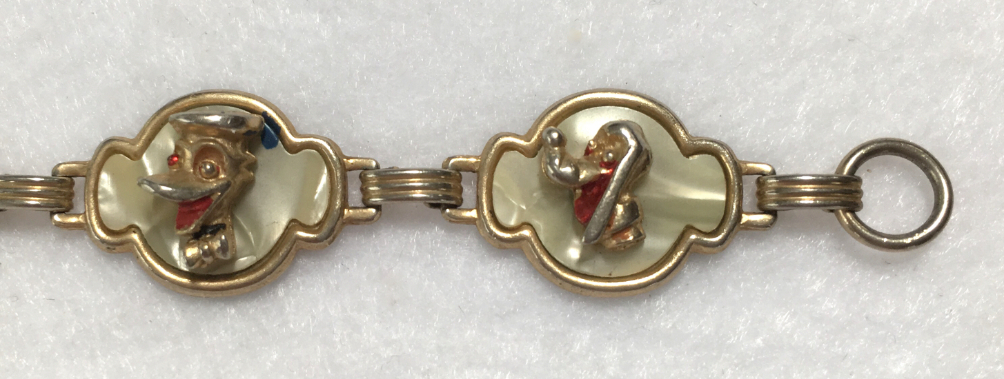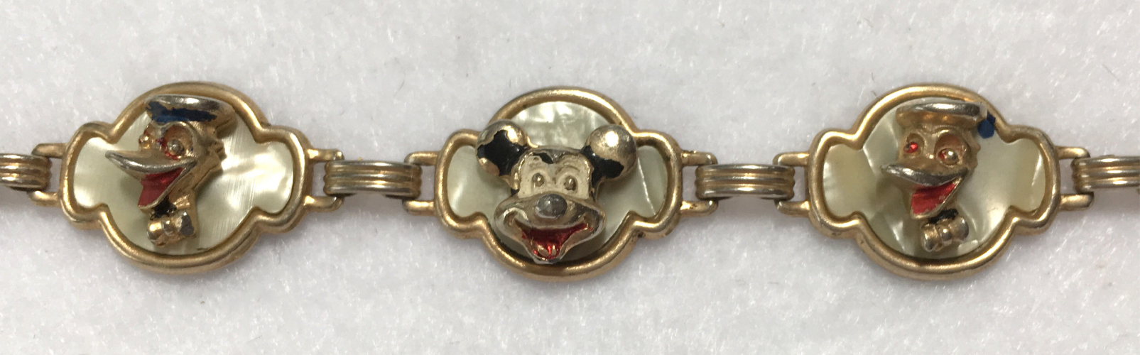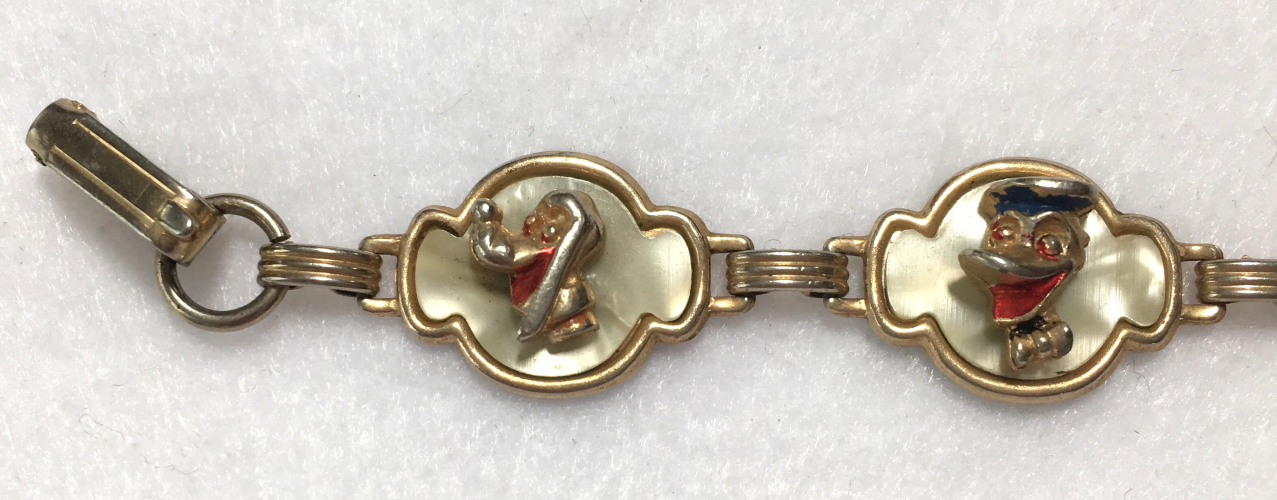 This is a cute vintage Disney bracelet featuring Mickey Mouse, Donald Duck and Pluto or Goofy or both (hard to tell them apart). Each of the characters is in a 3-D raised sculpture centered on a mother-of-pearl background. It is in very good used condition with some of the polychrome paint missing from wear. Clasp is in fine working condition and all joints are tight. It measures 6-1/2" long. (Click on pic for more photos.) |