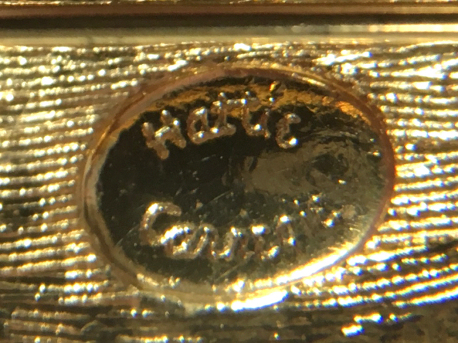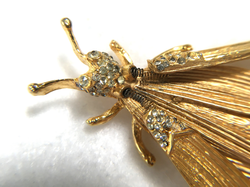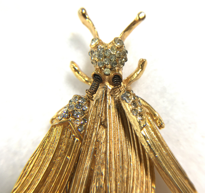 This whimsical brooch / pin was made by the famed designer Hattie Carnegie in the form of a cicada. It is called a "trembler" due to the fact that the jeweled wings are attached with tiny springs which cause them to flutter about with movement. These were popular in the 1940's and this vintage pin is in excellent condition for its age. All of the stones are present and the gold finish is very nice and shiny. Pin measures 2" long x 1-3/4" wide with wings spread in natural resting position. It is a real beauty! (Click on pic for more photos.) |
