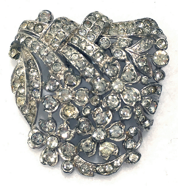 This beautiful Crown Trifari fur or dress clip is in the shape of a bouquet of flowers. It is very pretty and all of the crystal rhinestones are intact. The back of the clip is signed with the Crown Trifari mark and the clip is in excellent condition. I believe it dates from the late 1930's or early 1940's. Measures 1-3/4" at widest point (across bouquet). It can be worn in either of the positions shown. (Click on pic for more photos.) |