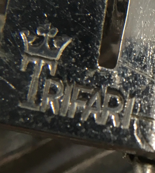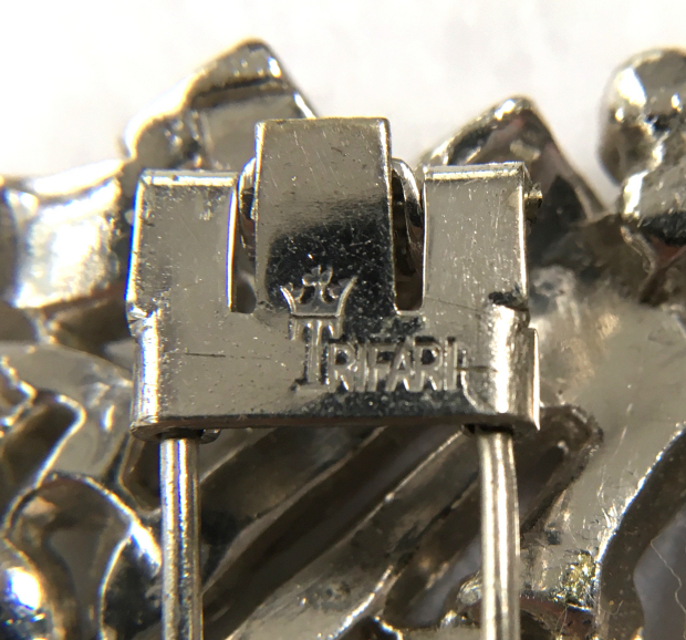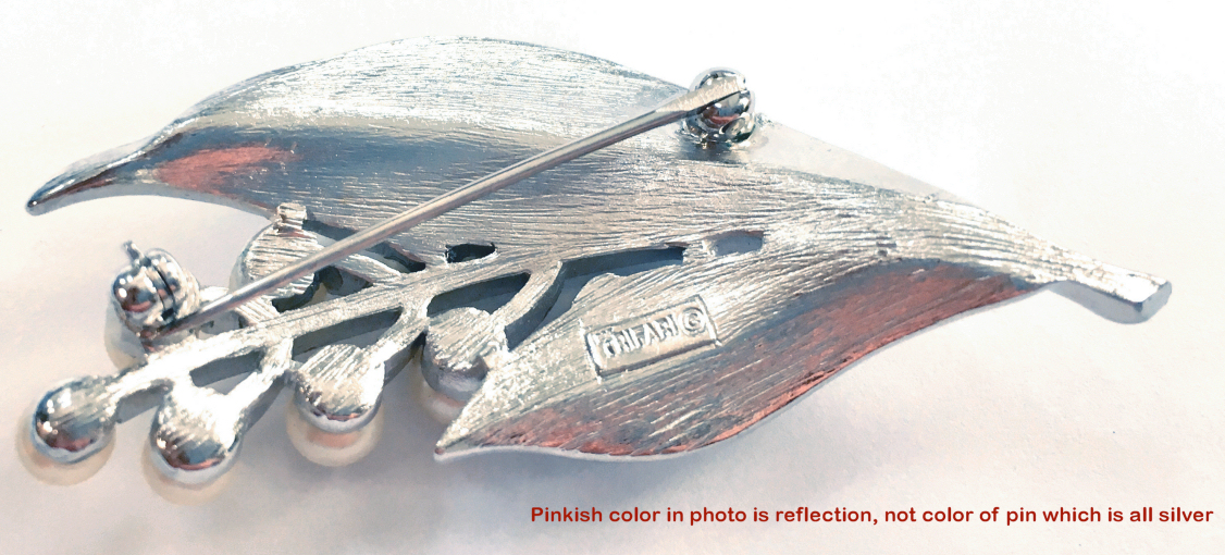 This beautiful Crown Trifari brooch / pin is in the shape of two silver leaves with clusters of pearls. It is very pretty and all of the pearls are intact. The back of the pin is signed with the Crown Trifari mark and the pin is in excellent condition. I believe it dates from the late 1930's or early 1940's. Measures 2" long x 1" wide. (Click on pic for more photos.) |