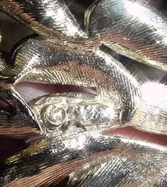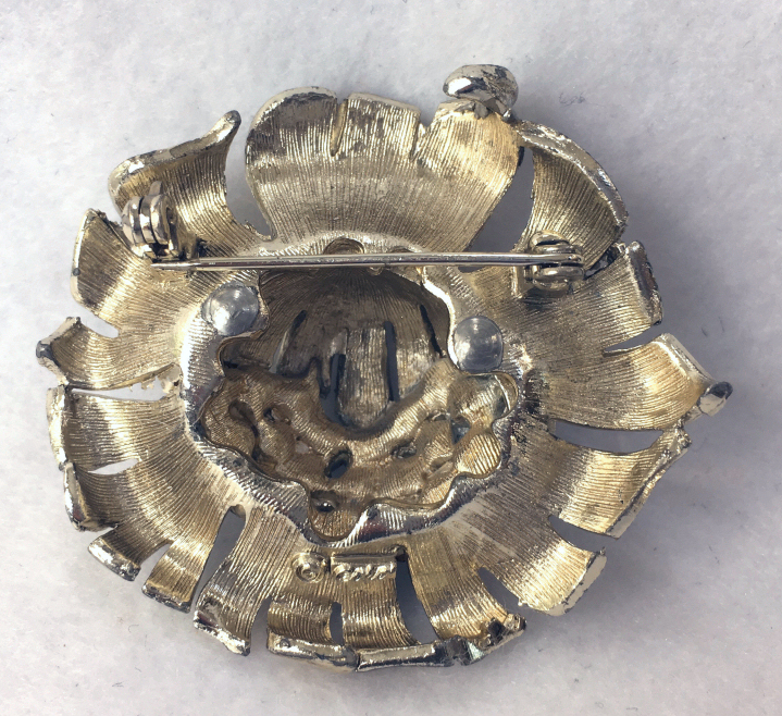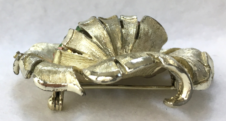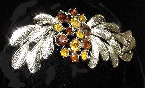 Lovely brooch in silver leaves with cluster of amber and rootbeer faux jewels in center. Signed "Cini" on the back, this nicely done pin measures 3-1/4" wide x 1-1/2" high. (Click on pic for more photos.) |