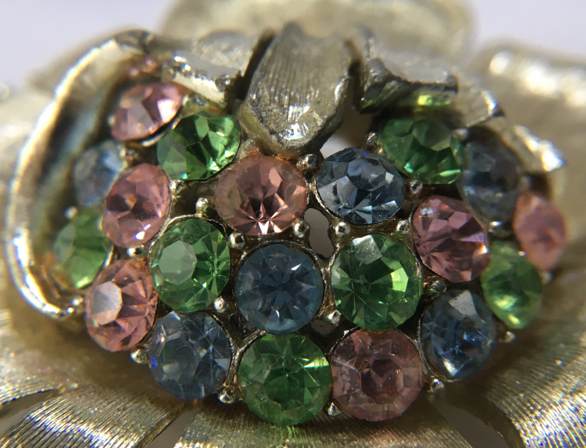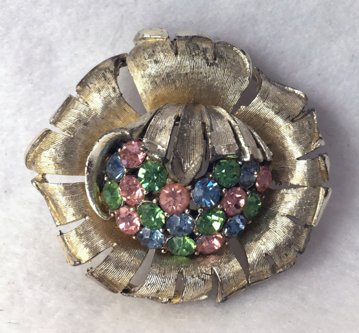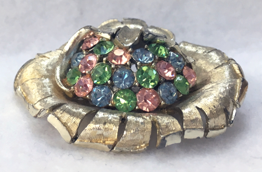 This is a very pretty brooch / pin in the shape of a flower with jeweled center. It is done in silvertone metal with jewels of blue, pink and green. All stones intact and it is in overall excellent condition. I have not tried to polish it as I prefer leaving jewelry as found. It measures 2" x 1-3/4". It is actually much prettier in person than the pictures show. (Click on pic for more photos.) |