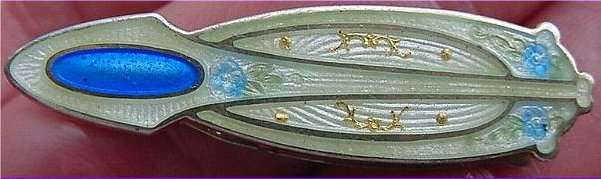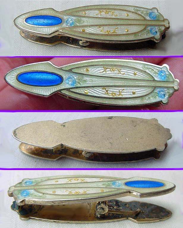 Pretty lady's sterling silver enamel guilloche scarf clip. Beautiful blue and white enamel guilloche flowers with gold accents. Enameling is perfect! Spring-loaded mechanism is in great shape and grips tightly. A beautiful accent piece! Can also be clipped onto a collar, hat brim, etc. Use your imagination! Measures 1-1/2" long x 3/8" wide. (Click on pic for more photos.) |
