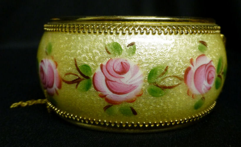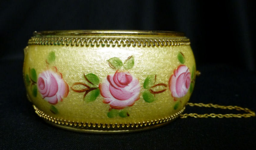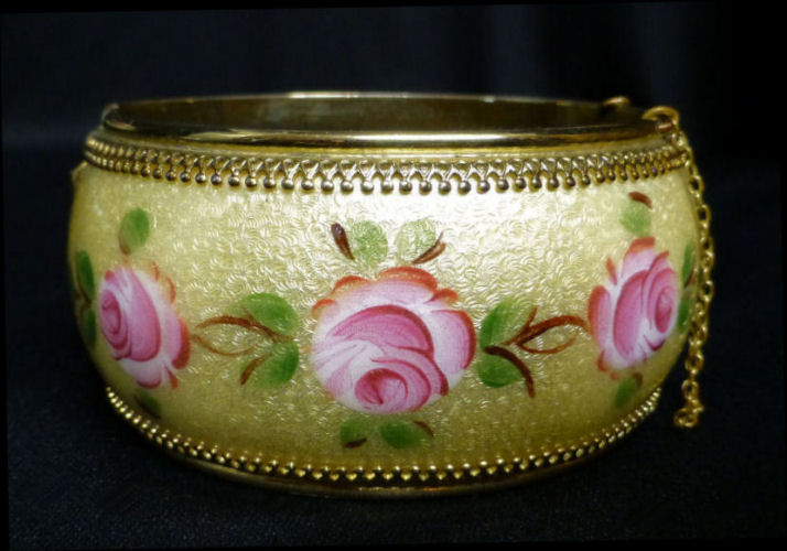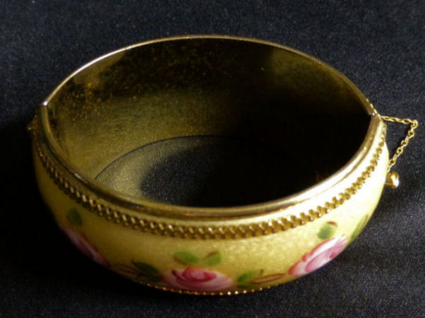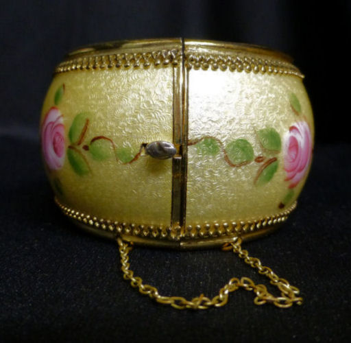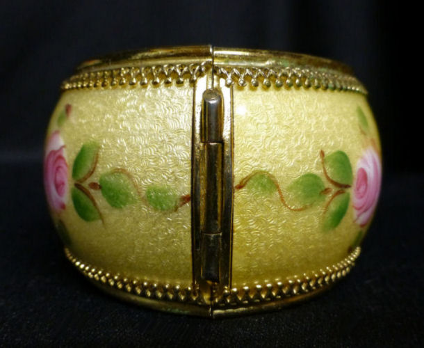 Beautiful hinged bangle bracelet by Whiting & Davis (signed inside). The life-like hand-painted roses go all the way around on a buttery yellow background with intricate guilloche designs which show through the enameling. Base metal is gold tone. It is in excellent condition with no damage whatsoever. A truly gorgeous piece! Safety chain by the clasp. It is oval shaped as opposed to round so it fits more comfortably on your wrist. Inside measurements are 2-3/8" across x 1-7/8" wide. Outside dimensions are 3" across x 2-1/2" wide. The width of the bracelet face itself is 1-3/8". (Click on pic for more photos.) |