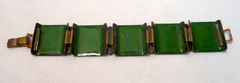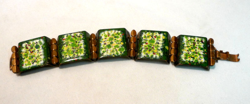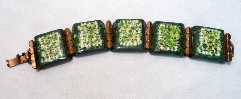 This is a lovely enamel on copper bracelet attributed to Matisse ... according to the books, unmarked pieces of Matisse were made before 1954. We are assuming this to be one such piece as we have found others identical to it that are marked which would be later. Based on that I would date this to the early 50's. The enamel on the front is bordered in deep hunter green with center vignettes of greens, yellow and red on white. The backs of the links are covered in green enamel. The copper has a nice patina which we like to leave as is ... I don't polish these as I prefer the aged look. It is in excellent condition. The bracelet measures 6-3/4" long with clasp closed x 1" wide. (Click on pic for more photos.) |