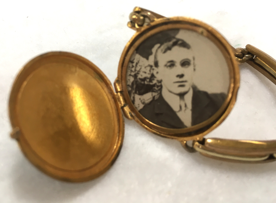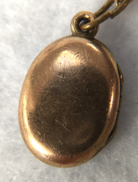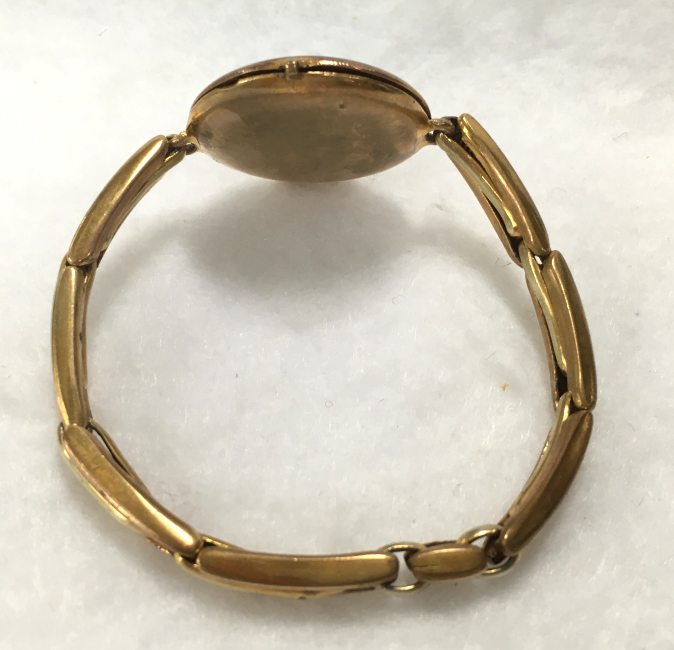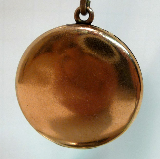 Here is a very pretty bracelet locket in a gold metal (bought as gold filled but I cannot find any markings anywhere). The top of the locket is a fully enamel guilloche cover in teal which is quite pretty. There is an area right near the opening that is either a manufacturing miss or a chip ... to be honest, it looks more like factory to me but there is a wee bit of enamel missing along the very edge. In my opinion, it is not a high quality piece so it could be original. Nevertheless, I bought this in 2005 for my own collection simply because bracelet lockets, watches, etc. are very difficult to find and I wanted it! LOL ... it is still a very desirable piece and the enameling is in excellent shape with the exception of the missing area I already mentioned. Inside the locket there is still a photo of a young man ... no idea who he is. The original retainer is still in plae but no mica covering. The attached wristband is elastic and can expand to slide over your hand. The locket measures just under 1-1/8" diameter. The wristband links are 3/4" long each and expand from that.