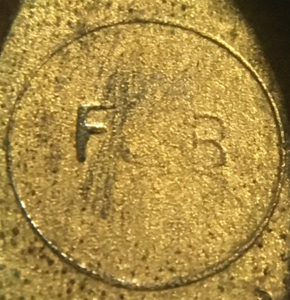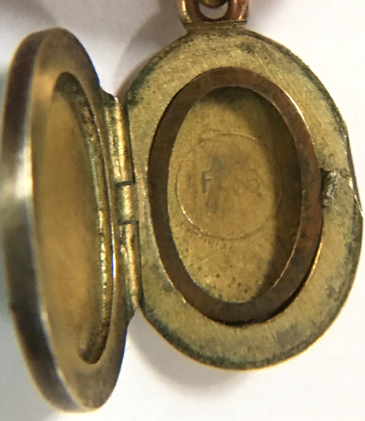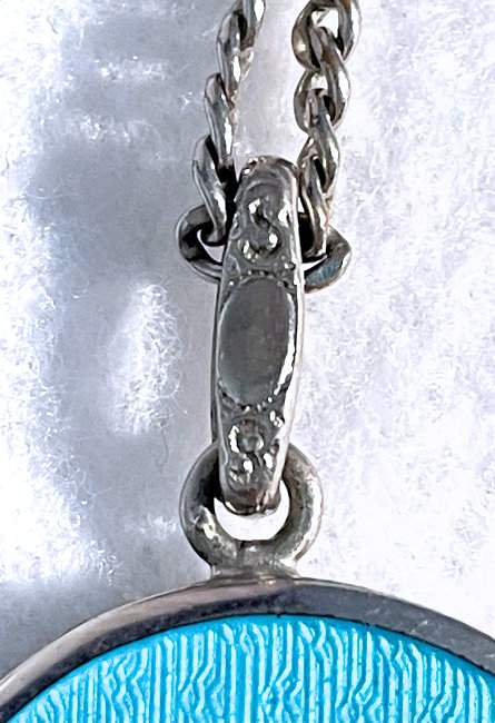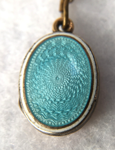 This gorgeous little locket is a beautiful shade of pale aqua blue with radiating guilloche designs surrounded by a thin border of white. The back of the locket is gold metal, whether or not it is solid gold I can't say as the piece is so tiny I can't see any hallmarks to indicate it as such but it does appear to be gold to my eye. The inside of the compact has a circle with the letters F and B clearly visible but the "&" sign is harder to see. Again, it is just so tiny ... the overall size of the locket is a wee 5/8" high x 1/2" wide. The chain is not original to the piece but was with it when I bought it so I am keeping it together. The chain has a tag with hallmarks on it that are either for sterling or gold, I cannot be sure, but it was made in Turkey. The chain measures 18" long not counting the bail. It is a beautiful piece with no damage to the enamel whatsoever; the back of the locket does have wear scuffs that are more visible in the photos than in person, bearing in mind that the photos are many times larger than the original piece!