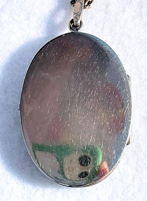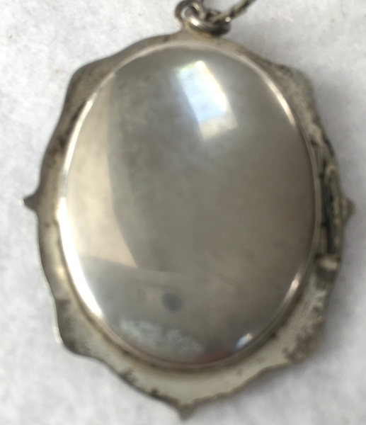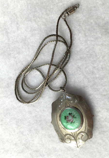 This delightful little locket is made of sterling silver with a beautiful hand-painted rose with blue forget-me-nots on the front. The locket is attached to a black ribbon with a matching blue enamel guilloche slide to adjust it. The locket is finished off with a tassel at the bottom. Back of the locket has incised lines and a little cartouche where a monogram could be added (none ever was). It is marked Sterling on the inside retainer ring. One retainer ring is still in place and the other is missing although a picture could be pressed into place. The enameling is in mint condition and the ribbon is also in like-new condition. The locket itself measures 1-5/8" x 7/8". With bail and tassel it is 3" long. The ribbon is 17" long when stretched out (double that for total length).