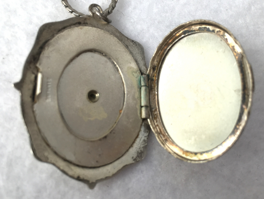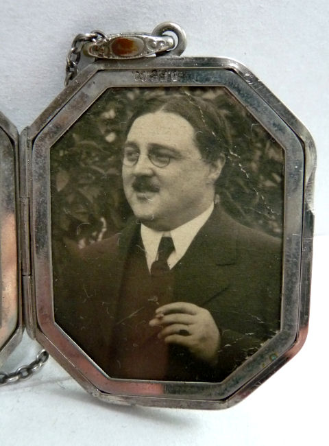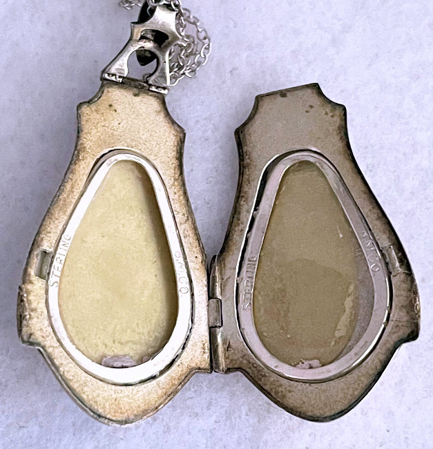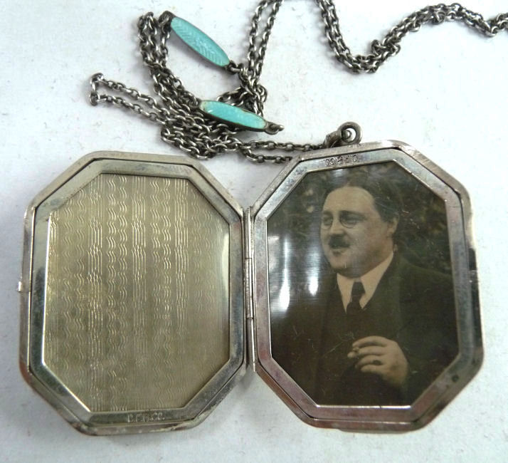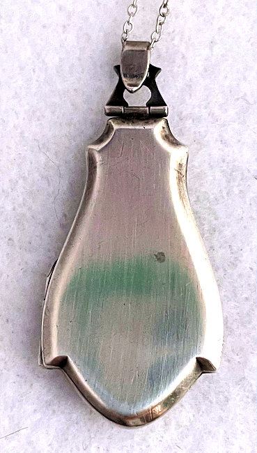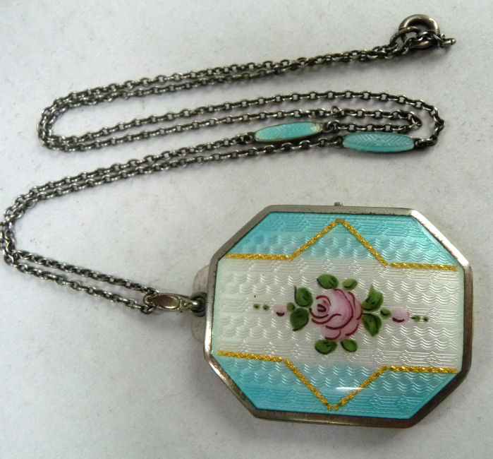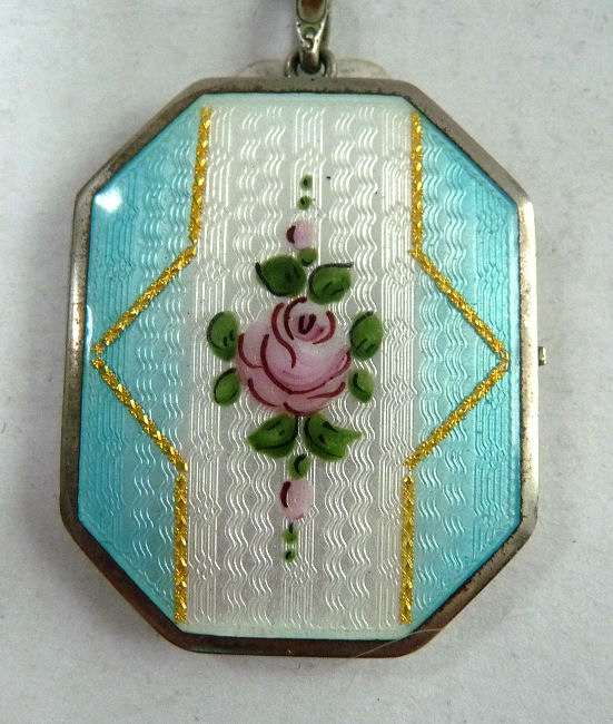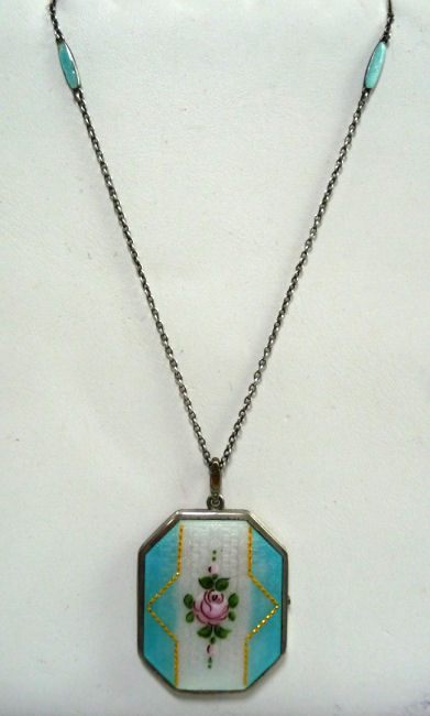 Here is a very pretty locket with the front covered entirely in lovely enamel guilloche with a hand-painted rose in the center on snow white with aqua blue sides accented in gold made by D. F. Briggs. The back of the locket is just plain silver. I cannot find a sterling mark on the case but there is a sterling stamp on the ring of the necklace. Inside is a double photo section, one side of which still retains a "handsome" (ahem!) distinguished looking gent ... perhaps the husband or father of the original owner. The protective photo covers are both still intact. The chain that comes with it has two blue enamel guilloche bars in very good condition ... there is just a bit of loss on the tip of one side of one bar. The locket's enamel guilloche is in excellent condition. It is signed on the inside rim of the locket on both left and right sides. Locket measures a wee bit over 1-1/2" high (not counting bail) x 1-1/4" wide. The chain is 20-1/2" long total not counting bail.