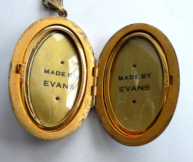 Evans makes some of the prettiest enamel guilloche lockets and this is another striking example done in double enamel guilloche (front and back) with hand-painted roses on the front. This one appears to have never been used as the original cello covers and papers are still found inside. I assume that the bail is original but the chain (which is gold tone) is more than likely not. But it is easy enough to change the chain to whatever size you want. The enameling on the front is perfect with no scuffs or scratches visible at all. The back is near perfect with a small flake in the enamel at the very bottom edge ... nearly invisible when hanging since it is on the curved portion (see photos). All in all, a great piece ready to use with your photos inside. Measures 1-1/8" wide x 1-5/8" long not counting bail.