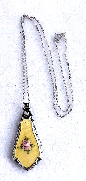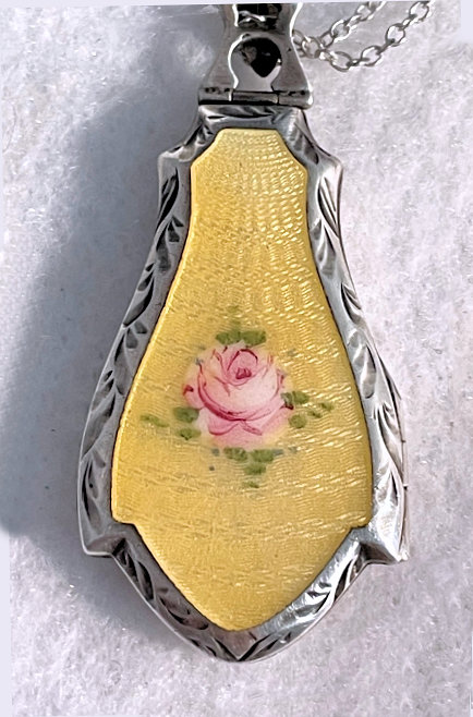 This gorgeous little sterling silver locked with a full pale buttery yellow enamel guilloche front with hand-painted pink rose was made by the Birmingham Medal Co. of Birminham, England, circa 1920's-30's. It has an embossed border around the guilloche front and a polished back. The bail is exceptionally nice in that it has an open end through which to insert the chain. Inside the piece is hallmarked on both sides for STERLING and BMCO and still retains the original mica covers. I have included a new sterling silver chain to go with it. Excellent condition with no damage but there is a small spot on the back that may polish out. Enamel is all perfect! The locket itself measures 1-3/8" long x a bit over 3/4" wide . The chain and bail add a 9-1/4" drop.
