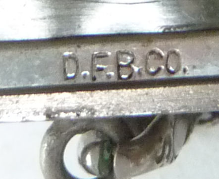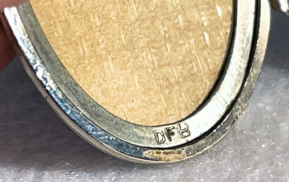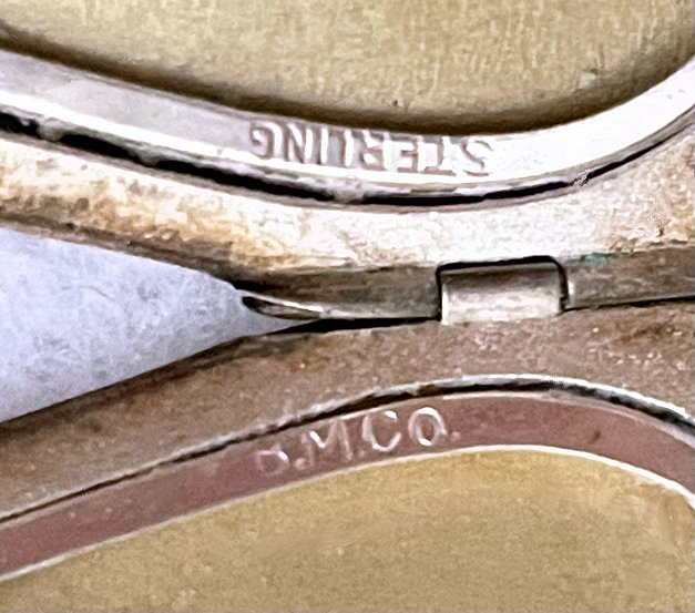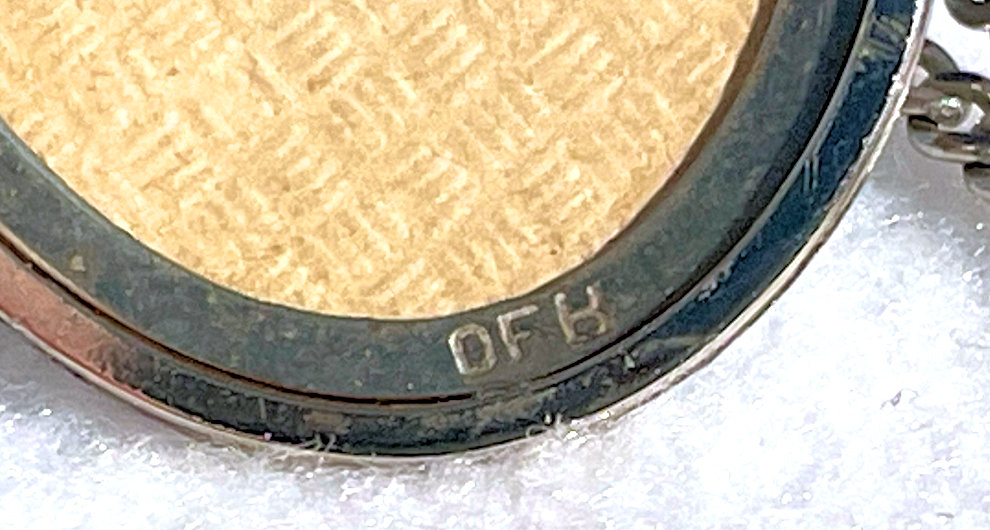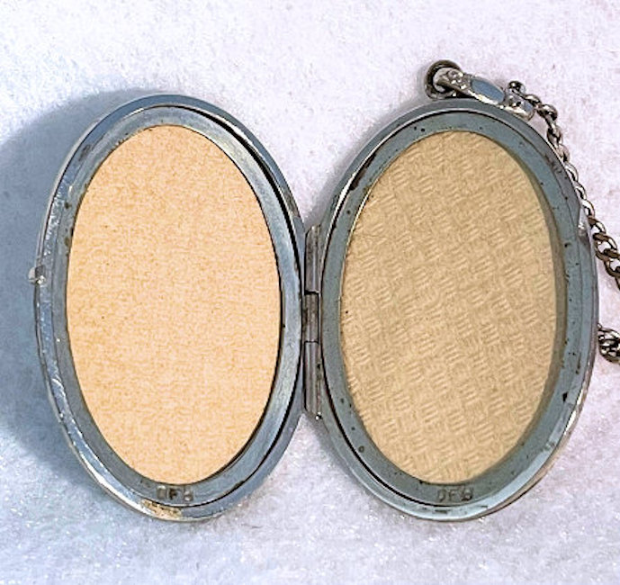 I have not run across many lockets made by D. F. Briggs ... mostly they dealt in compacts and necessaires but this is an exception. This lovely locket is oval shaped and has a bright turquoise enamel guilloche with hand-painted pink roses on the left side and a gold butterfly fluttering nearby. Inside the locket can be found two sections for small photos with the original retaining rings and cello covers still intact. Both sides are marked D.F.B. at the bottom of each. The chain that came with this is also very pretty and has an embossed (both sides) bail and embossed links as well. I cannot find any sterling marks so can't say that it is but it does tarnish like silver so maybe it is. I have not removed the covers in the locket to see if there are any markings beneath those, so possibly it is there. Excellent condition with no damage whatsoever. The locket measures 1-1/2" long x 1-1/8" wide . The chain and bail add a 10-1/2" drop.