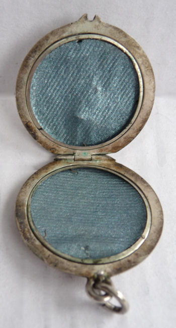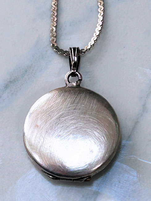 This is a teeny-tiny little sterling silver locket with an ivory-toned enamel guilloche front with hand-painted roses in a wreath shape with blue ribbon bow at the top. It is so delicate and pretty and is in perfect conditon with no damage to the enamel at all. It opens to reveal a small picture holder on one side with retainer ring and blue enameling on the reverse. It comes with a sterling silver chain (marked 925). This sweet little locket measures a tad under 7/8" diameter and the chain is 20" overall.
