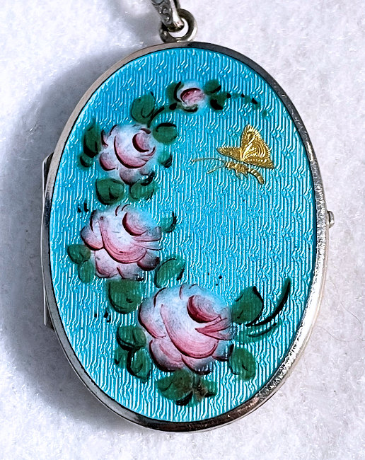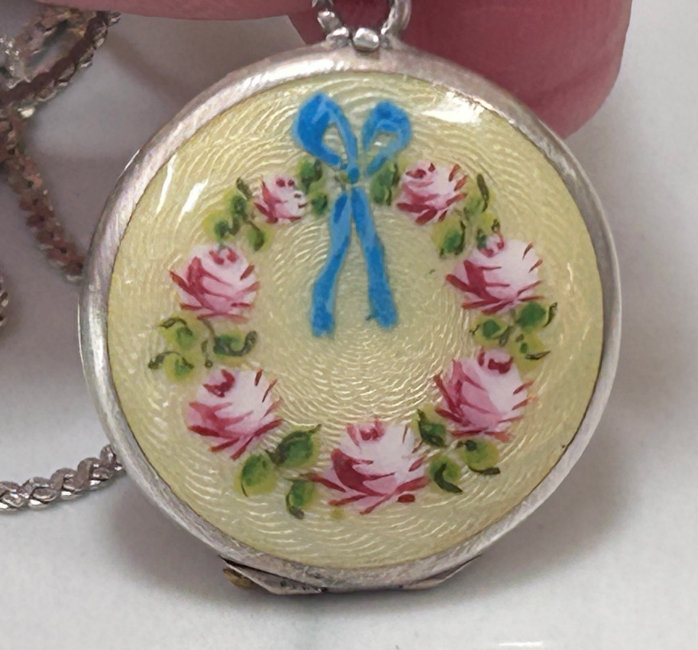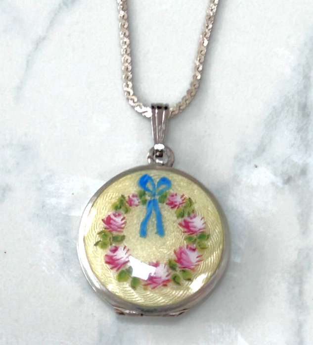 Sterling Silver Hand-Painted Enamel Guilloche Tiny Locket with Hand-Painted Roses Made in Germany with Sterling Silver Chain
