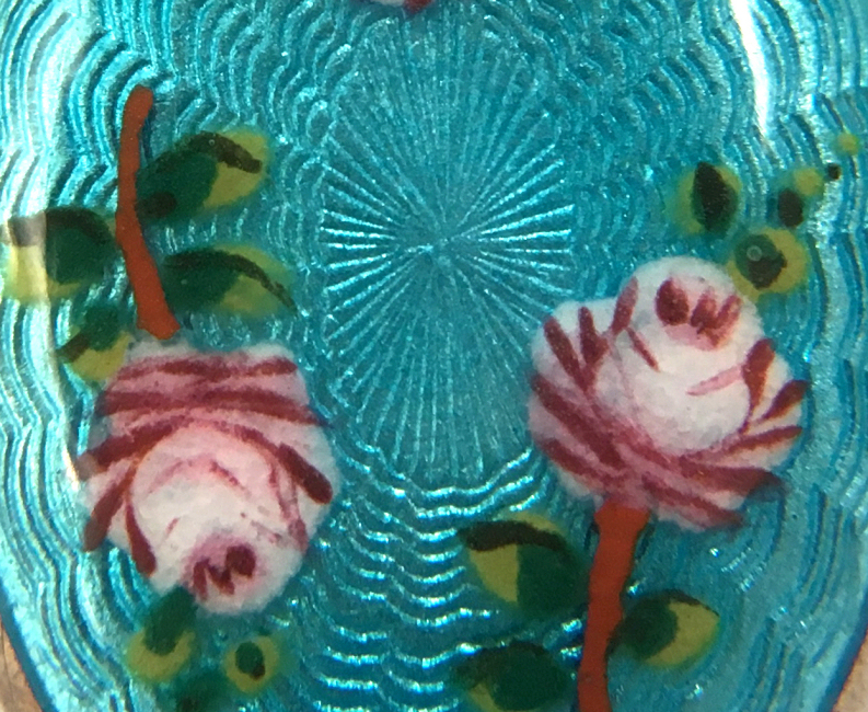 This truly beautiful little locket is made of Sterling Silver from Germany and has a fully hand-painted front in turquoise enamel guilloche with pink hand-painted roses in full bloom. It is just so pretty! And the back side of the locket is also done in the same turquoise enamel guilloche minus the roses. The enamel is all in absolutely pristine condition with no apologies whatsoever. Inside the locket can be found two sections for small photos with the original retainers still intact (the mica covers are not there). It is a truly beautiful little locket ... I will include a new sterling silver chain to go with this piece so it can be worn right away! The locket measures almost 1" long (with bail) x 5/8" wide .